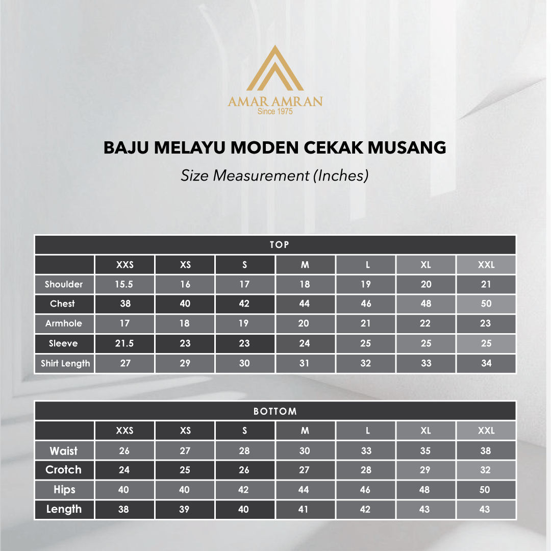 Baju Melayu Cekak Musang is a collection of clothes that execute your neat and stylish style. Available in an array of colors, this pair of Baju Melayu Moden Cekak Musang from Amar Amran will keep your traditional look smart and upkeep. Simple yet traditionally sophisticated, this number makes an ideal pair for various types of occasions.